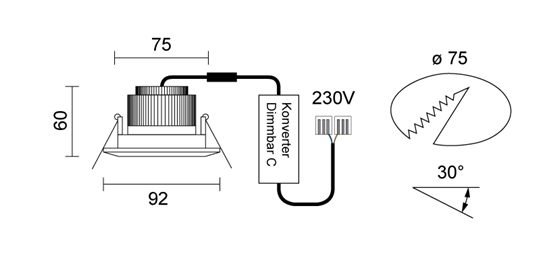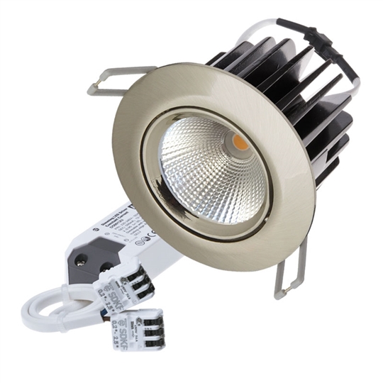 LED Einbauspot Komplettset 230V mit dimmbaren LED Konverter LC, LED Chip: Citizen, LED Vorwärtsspannung: 500mA/17.5VDC, Lichtfarbe 3000°K, SDCM <3, Farbwiedergabe CRI 92, Mittlere Lebensdauer 50000 Stunden/L70 B50, Ausstrahlwinkel 38°, schwenkbar 30°, für Umgebungstemperatur Ta: -20°...45°C, Schutzgrad IP44 von unten, Schutzklasse ll, Normen: CE, Gehäuse aus Aluminium, Gehäusefarbe nickel gebürstet, geschlossene Linse, Befestigung mit Torrsionsfedern, inkl. dimmbaren Konverter (Phasenabschnitt Dimmer verwenden), Anschlusskabel sekundär 250mm mit verpolungssicheren Stecker, Anschlusskabel primär 250mm mit 3-poligen Schnellverschlussklemmen Electro Terminal, 5 Jahre Garantie auf Leuchte & Konverter.
