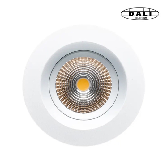 Gering blendedes LED Einbauleuchten Set inkl. Betriebsgerät extern, dimmbar DALI + Touchdim, 230V Anschluss mit Drückklemmen und Schnellverschlussbox, Farbwiedergabe CRI 90, Mittlere Lebensdauer 50000 Stunden/L80/B20, Ausstrahlwinkel 36°, starr (nach hinten versetzte LED Diode), Schutzgrad IP54, Schutzklasse ll, Normen: CE, Gehäuse aus Aluminiumdruckguss, Gehäusefarbe weiss, geschlossene Linse, Befestigung mit Torrsionsfedern, Anschlusskabel sekundär 200mm, 5 Jahre Garantie.
