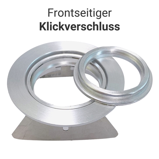 Einbauspot • schwenkbar 30° • Gehäuse Aluminium • Gehäusefarbe schwarz eloxiert • Befestigung mit Blattfedern • mit frontseitigem Leuchtmittel Klickverschluss • geeignet für LED-Lampen Ø50mm • Lieferung ohne Zubehör (separat bestellen).