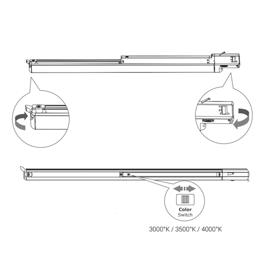 Kompakte Leuchte für die Montage in 3-Phasen-Stromschienen mit 3ph-Adapter, inkl. Konverter für Ein/Aus Betrieb, verstellbare Lichtfarbe mit Color Switch 3000/3500/4000°K, Ausstrahlwinkel 110°, opaler Diffusor, Farbwiedergabe CRI90, Gehäuse aus Kunststoff & Aluminium, Gehäusefarbe weisss RAL 9016, Schutzklasse I, IP20, Lebensdauer 35`000h L80 B20, 5 Jahre Garantie.