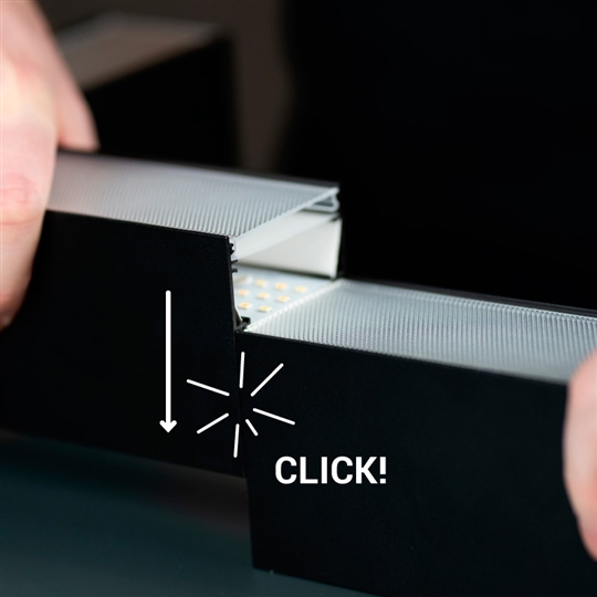 Click, das flexible Linearsystem mit einer revolutionär schnellen Installation. Elektrische und mechanische Verbindung mit einem einfachen Klick. DIP-Schalter zwischen 3000 und 4000°K bei allen Modulen. Dimmbar und unterstützt DALI2. Bis 20m oder 600W pro Anschluss. Montage direkt an der Decke, abgependelt oder an der Wand. Lebensdauer 100 000h/L80/B20. 5 Jahre Garantie.