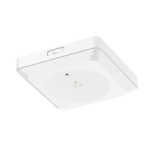 LED Notleuchte für Deckenanbau, mit Flächenoptik, mit Einzelbatterie Notdauer 3 Stunde, Automatischer Selbsttest, Bereitschaftsbetrieb, Leuchtenkörper aus Kunststoff, Gehäusefarbe weiss, mit LiFePO4 6.4V 1500mAh, Aufladezeit 12 Stunden, Schutzklasse II, Schutzart IP20, Garantie 2 Jahre.