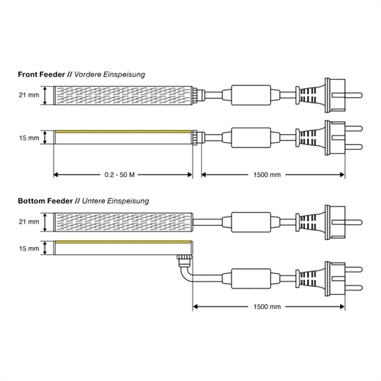 LED Lichtschlauch 230V IP65, max. 50m pro Anschluss, nach oben und unten biegbar bis Radius 12cm, dimmbar mit Phasenabschnittdimmer, 140 LED`s pro Meter, Beständigkeit gegen Wasser, UV-Strahlung, Seeluft, Ausstrahlwinkel 120°, Farbwiedergabe CRI80, Mittlere Lebensdauer 50000h L70 B50, für Umgebungstemperatur Ta: -25°...35°C, teilbar alle 200mm, Rolle maximal 50m, TÜV-CE und RoHS zertifiziert, ohne Anschluss-Set und Zubehör (separat bestellen), wird nur konfektioniert geliefert, 5 Jahre Garantie.