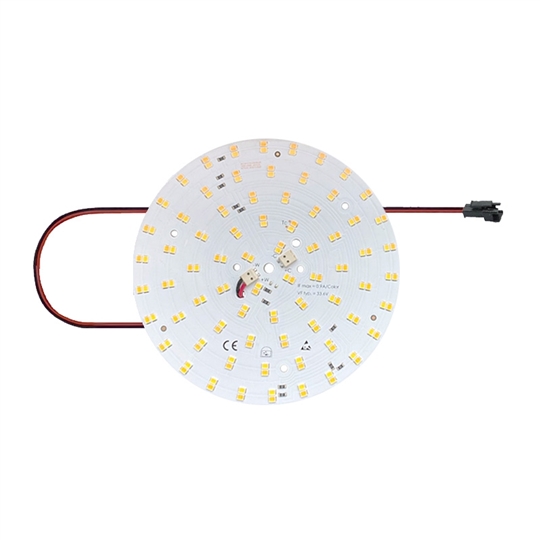 Runde LED Platine, geeignet für die schnelle Umrüstung konventioneller runder Leuchten. Kann mit optionalen Magnetbefestigungssets direkt an magnetische Oberflächen angebracht werden (siehe Zubehör). An den optionalen LED Konvertern kann der Ausgangstrom mit DIP-Switch Schaltern eingestellt werden (siehe Zubehör). Für Ein/Aus oder Dimmbetrieb geeignet. Lichtfarbe 3000/4000°K kann durch umstecken der Anschlusskabel eingestellt werden. Ausgangsspannung befindet sich im SELV-Bereich unter 50V. LED Platine 1-teilig mit Anschlusskabel 250mm mit Stecker (+ rot/- schwarz) mit Buchsenteil AWG22. 5 Jahre Garantie.