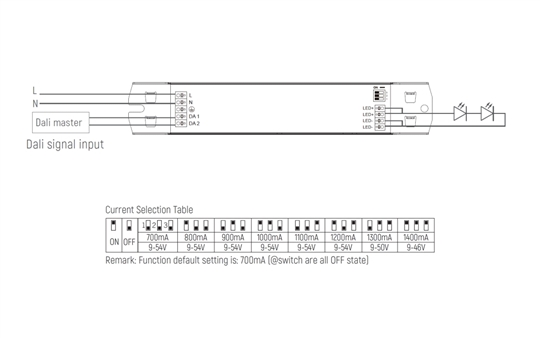 Der LED Treiber mit Konstantstromausgang für den Betrieb von LED Beleuchtungsanwendungen von 700-1400mA im Spannungsbereich von 9 bis 54Vdc. Regulierbar DALI oder TOUCHDIM. Der Ausgangsstrom kann per DIP Switch am Gerät eingestellt werden. Eingangsspannung 220-240Vac, Vorwärtsspannungsbereich 9 bis 52Vdc, Einstellbare Ausgangsströme 700mA / 800mA / 900mA / 1000mA / 1100mA / 1200mA / 1300mA (Factory Setting 700mA), 5 Jahre Garantie.