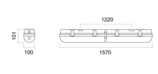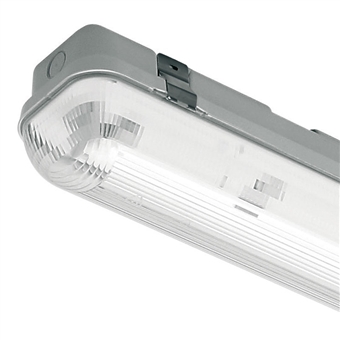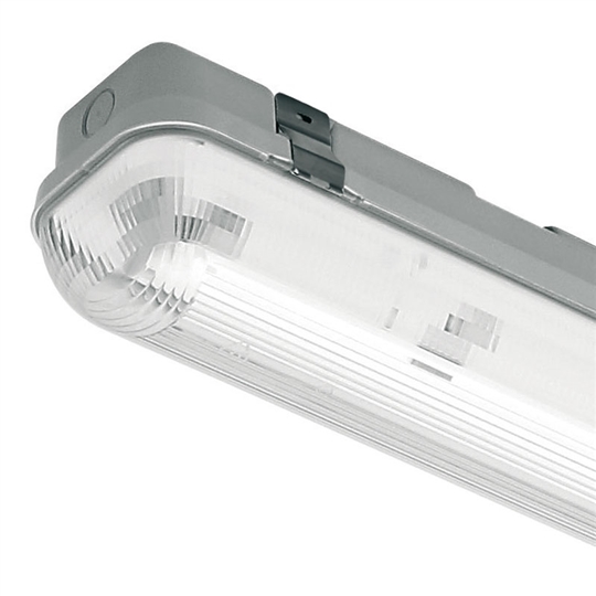 Feuchtraumleuchte für Leuchtstofflampen T8, 230V, mit elektronischem Vorschaltgerät EVG A2, Gehäuse aus Polycarbonat, Diffusor aus prismatischem PMMA Kunststoff, Inox Clips für Deckenbefestigung sowie Diffusorbefestigung, Farbe grau, IP65, ohne Leuchtmittel.